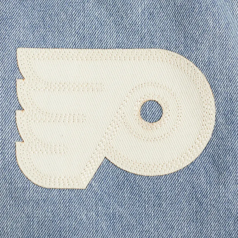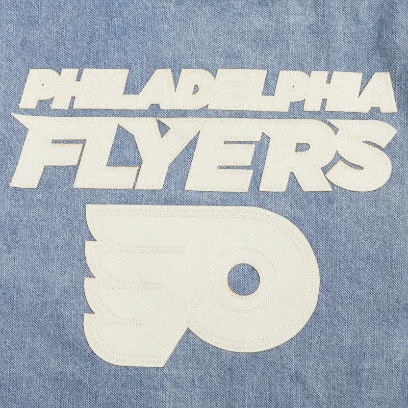 NHL PHILADELPHIA FLYERS VARSITY BLUES MEN’S DENIM VARSITY JACKET (DENIM\/LINEN)